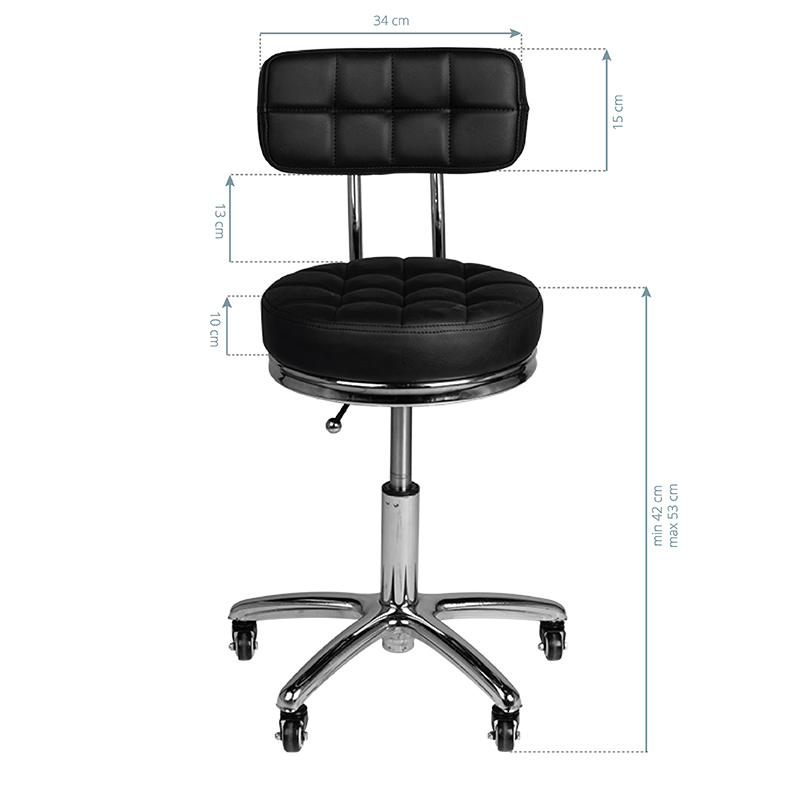 zwarte Cosmetische tabouret kruk met een gewatteerde zitting en een comfortabele rugleuning. Hij is in hoogte verstelbaar en het armachtige onderstel is voorzien van stevige metaal-rubber wielen.