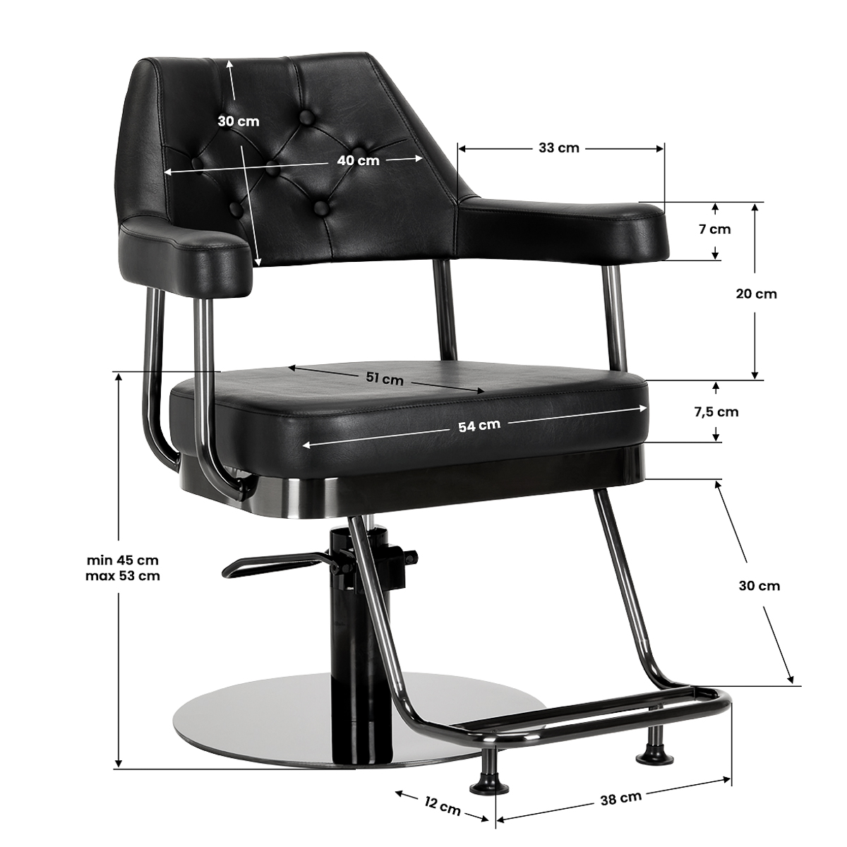 Dank des robusten hydraulischen Lifts kunt u de hoogte aanpassen binnen 45- 53 cm, zelfs als de klant op de stoel zit. Dit garandeert meer ergonomisches Arbeiten, dankzij de mogelijkheid om het zitniveau vrij aan te passen aan de lengte van zowel de klant als de kapper. Die profilierte Rückenlehne, versierd met quilten met bijpassende knopen, zorgt ervoor dat je een comfortabele houding kunt aannemen. Dit zorgt voor voldoende ondersteuning van de rug, wat belangrijk is, vooral bij urenlange behandelingen. Een groot pluspunt, maar ook visueel interessant, is de subtiele opening tussen de rugleuning en de zitting. Het maakt het gemakkelijker om de salon schoon te houden, waardoor u gemakkelijk het haar uit elk hoekje en gaatje van de stoel kunt vegen, tijdbesparend bij het voorbereiden van de werkplek tussen klanten door.