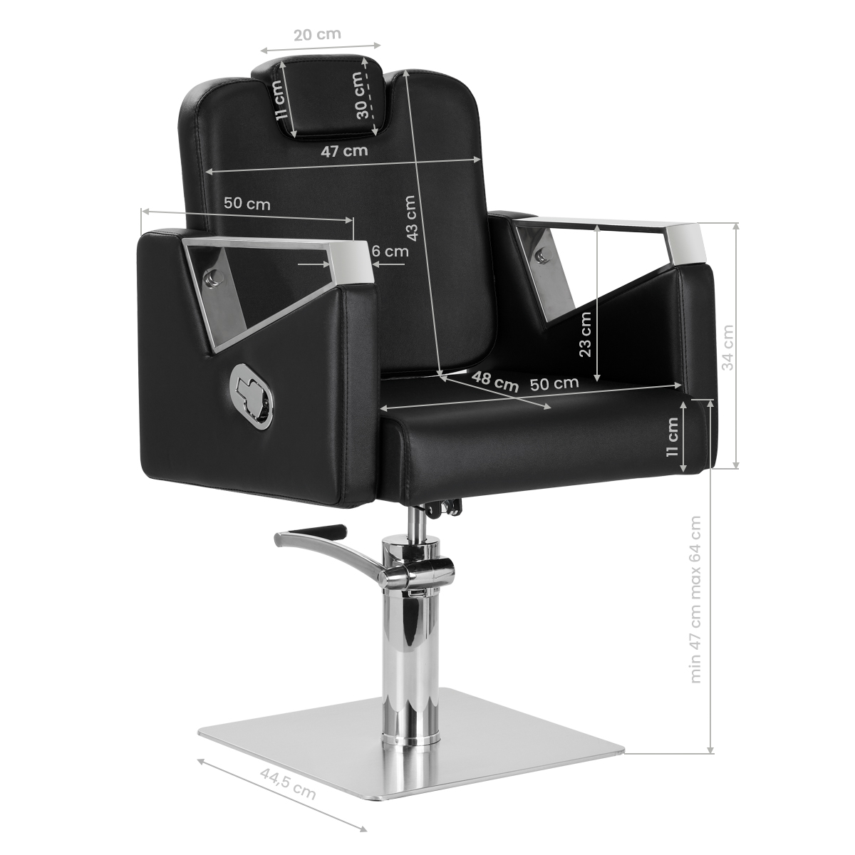 Dankzij de duurzame hydraulische lift kunt u de zithoogte verstellen binnen 47-64 graden cm, zelfs als de cliënt in de stoel zit. Dit garandeert ergonomischer arbeiten, Die Sitzhöhe kann an die Körpergröße des Kunden und der behandelnden Person angepasst werden. Der Stuhl hat een verstelbare rugleuning, waardoor de cliënt in eine bequeme, halb liegende Position kan worden geplaatst. Deze instelling garandeert een betere toegang tijdens bepaalde diensten. Bovendien biedt de intrekbare hoofdsteun uitstekende ondersteuning voor het hoofd, waardoor het kann an individuelle Bedürfnisse angepasst werden.