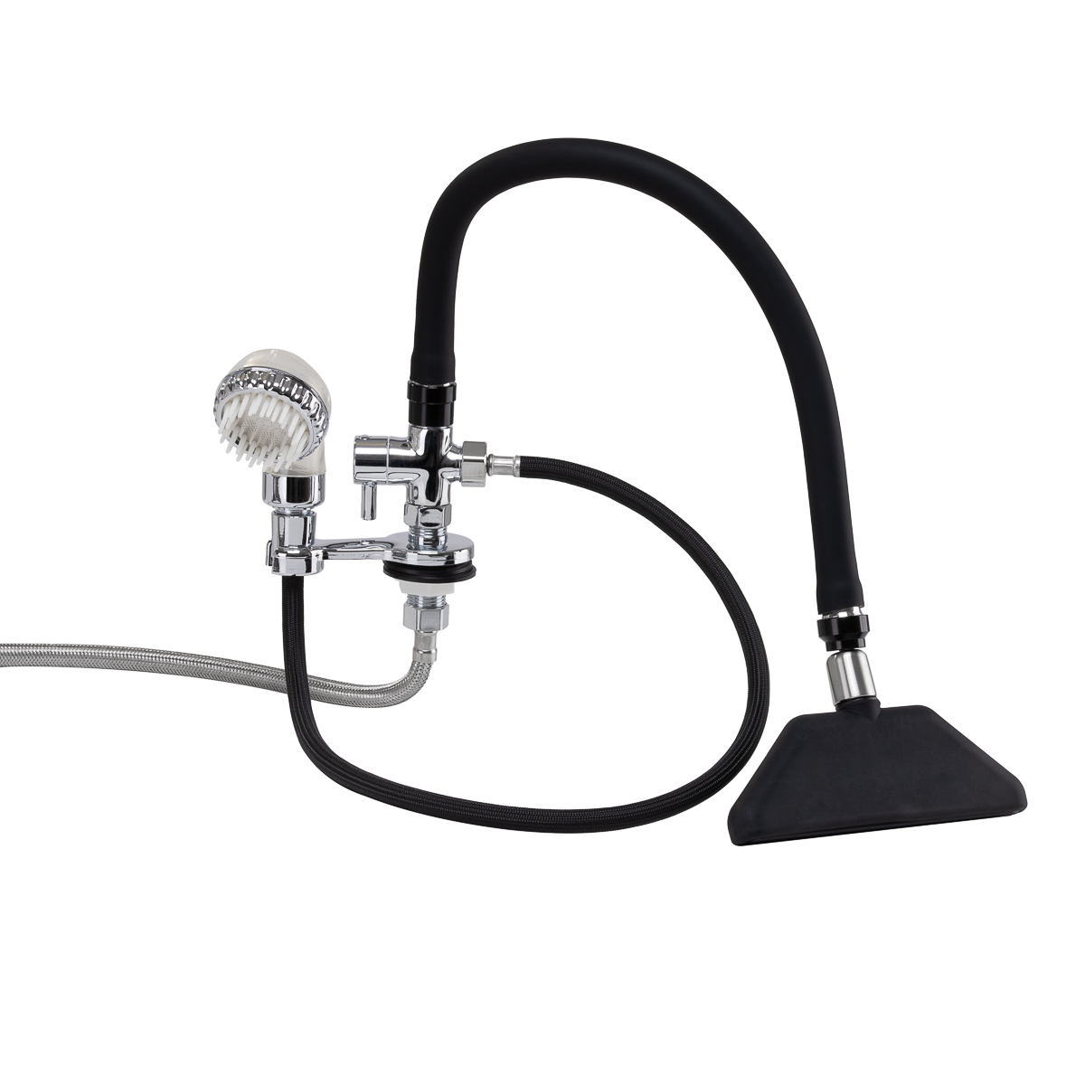 Die Armatur ist mit zwei Handreglern ausgestattet, die eine vielseitige Nutzung ermöglichen. Die klassische Handbrause, ideal für normale Haarwäschen, bietet einen präzisen und gleichmäßigen Wasserfluss. Angereichert mit Turmalinkügelchen mit Filter- und Adsorptionseigenschaften, bietet sie zusätzlichen Schutz für Haar und Kopfhaut. Der Wasserfallhahn mit einer Öffnung von 16 cm bietet dagegen einen breiten Wasserstrahl, der sanft, aber effektiv ist und außergewöhnlichen Komfort beim Haarewaschen garantiert.