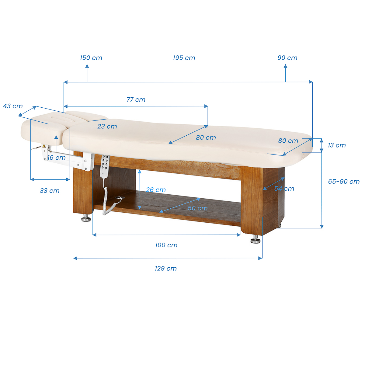De massief houten en metalen basis zorgt voor hoge stabiliteit en veiligheid tijdens cosmetische, schoonheids- en massagebehandelingen. De duurzame constructie garandeert betrouwbare ondersteuning, zelfs tijdens intensief gebruik, en zorgt voor comfort voor zowel de cliënt als de specialist. De warme houttint in combinatie met de ingetogen kleuren van het matras zorgt ervoor dat de ligstoel perfect past in de elegante interieurs van massagesalons, schoonheidssalons en wellnessruimtes.