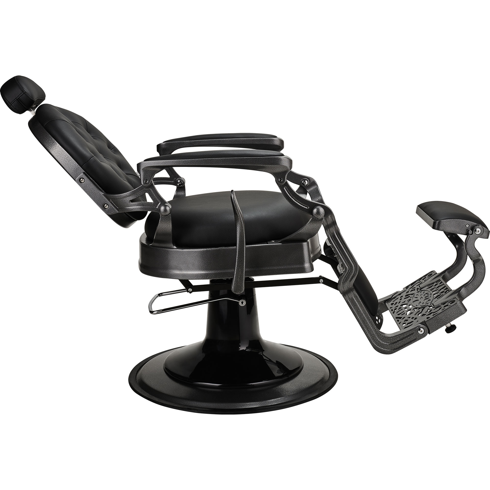 La construction solide en acier repose sur une base très stable avec un cadre en caoutchouc. Grâce à cela, le fauteuil de barbier ne glisse pas et ne raye pas le sol.