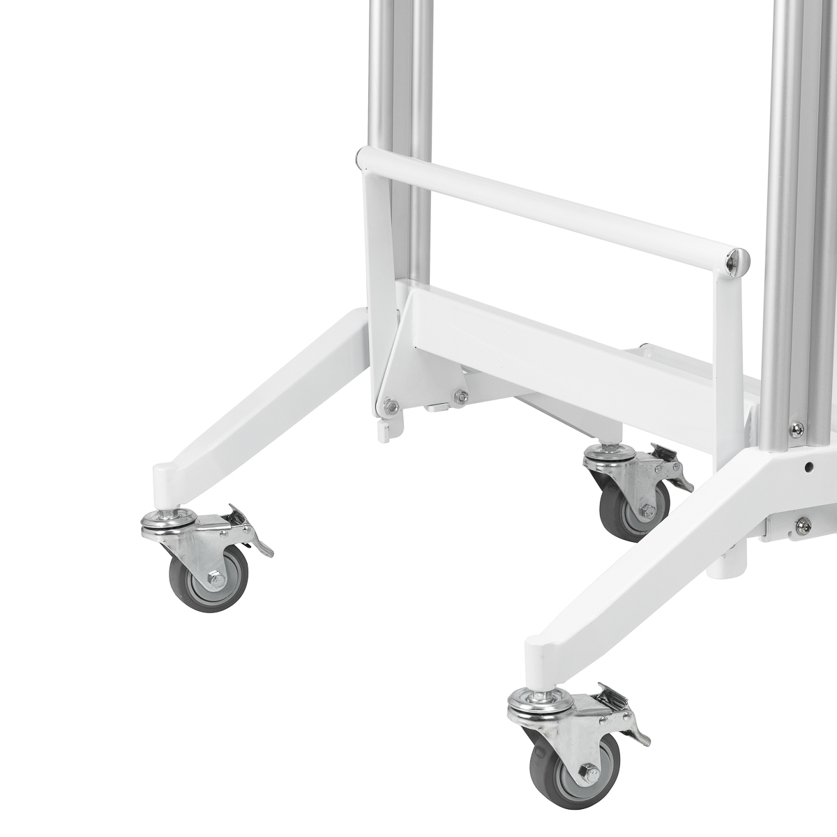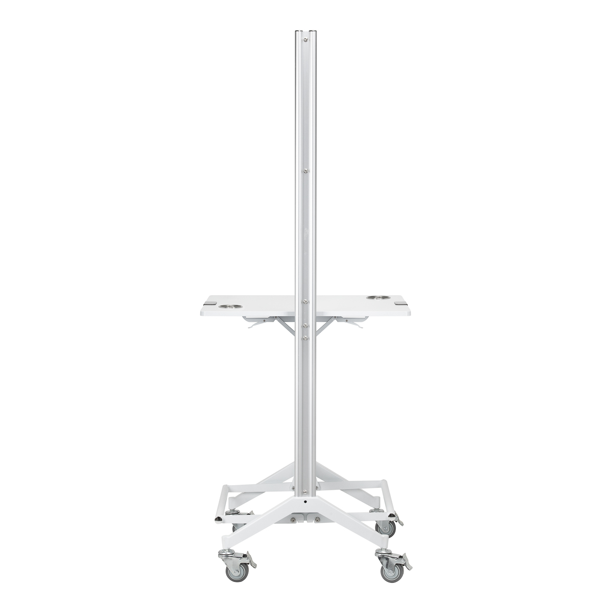 Een praktische opvouwbare plank op een hoogte van 90 cm is een van de belangrijkste voordelen van de MI-03-console, die ruimte bespaart en tegelijkertijd functionele opslagruimte biedt. Bovendien zorgen het dubbelzijdige ontwerp en de vergrendelbare zwenkwielen voor mobiliteit en gemak bij het verplaatsen van de console. Gaten in de plank dienen als houder voor een föhn, waardoor deze nog praktischer is en afgestemd op de behoeften van kappersprofessionals.