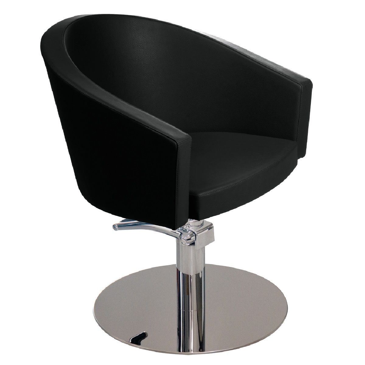 Kappersstoel gemaakt van geïnjecteerd schuim, gemonteerd op een rond roestvrijstalen frame met een glanzende afwerking, 360° draaibaar en voorzien van een vergrendelbare hydraulische pomp.