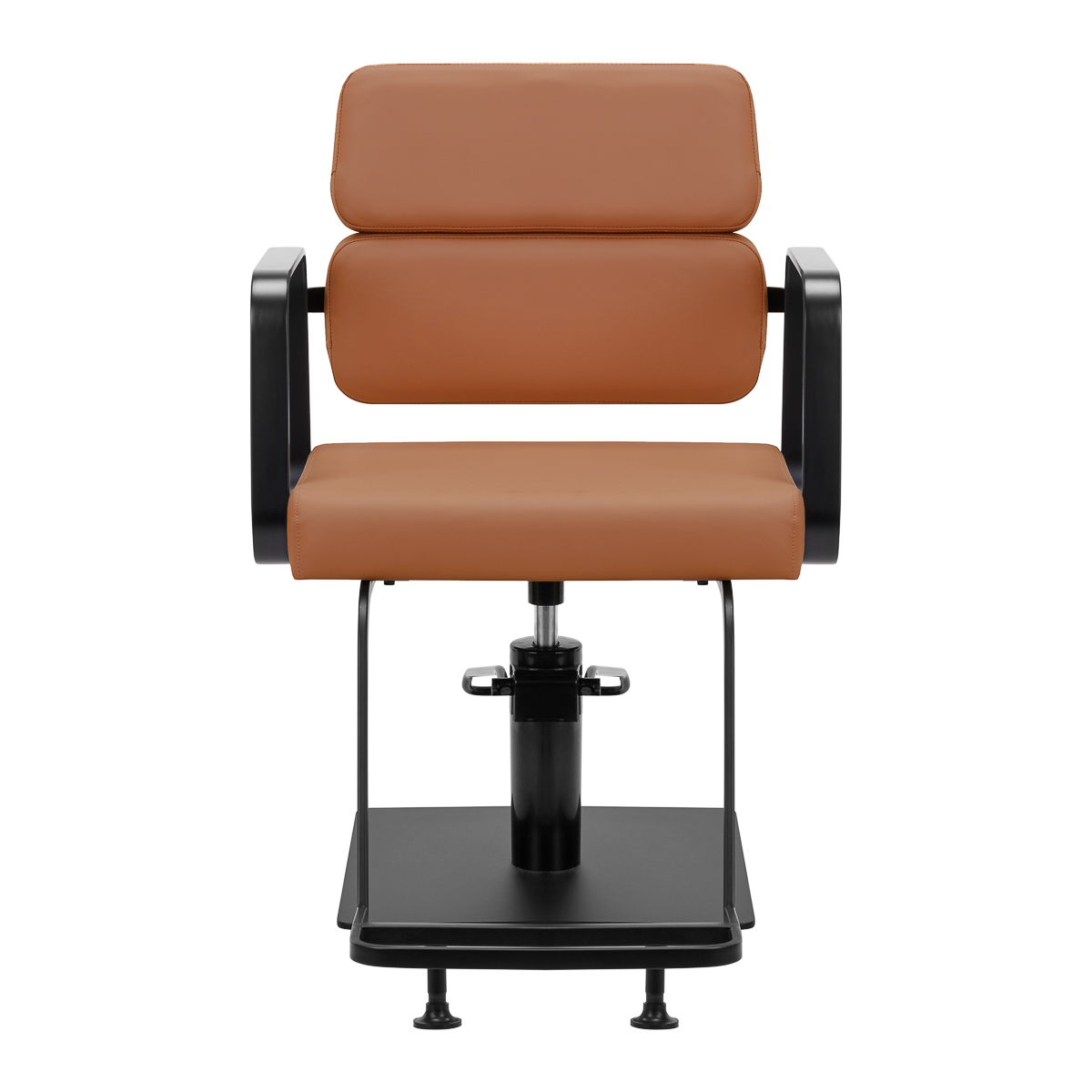 Het volledige rotatiemechanisme van de stoel maakt het werk van de kapper effectiever en comfortabeler. Een solide, vlakke, vierkante basis garandeert stabiliteit tijdens gebruik. Het matte, gladde oppervlak geeft het element een elegante uitstraling en maakt het gemakkelijk schoon te houden. Een comfortabele zitting met schuimvulling zorgt voor een hoog gebruikscomfort, zelfs tijdens vele uren behandeling. Geometrische, metalen armleuningen zorgen voor de juiste positionering van de schouders van de klant – dit betekent dat hij zijn hoofd niet in zijn schouders steekt of onderuitgezakt zit – wat het veel gemakkelijker maakt om precieze behandelingen uit te voeren, inclusief knippen. Een stijlvolle voetensteun, speciaal voor dit model, biedt stabiele ondersteuning voor de voeten van de gebruiker.