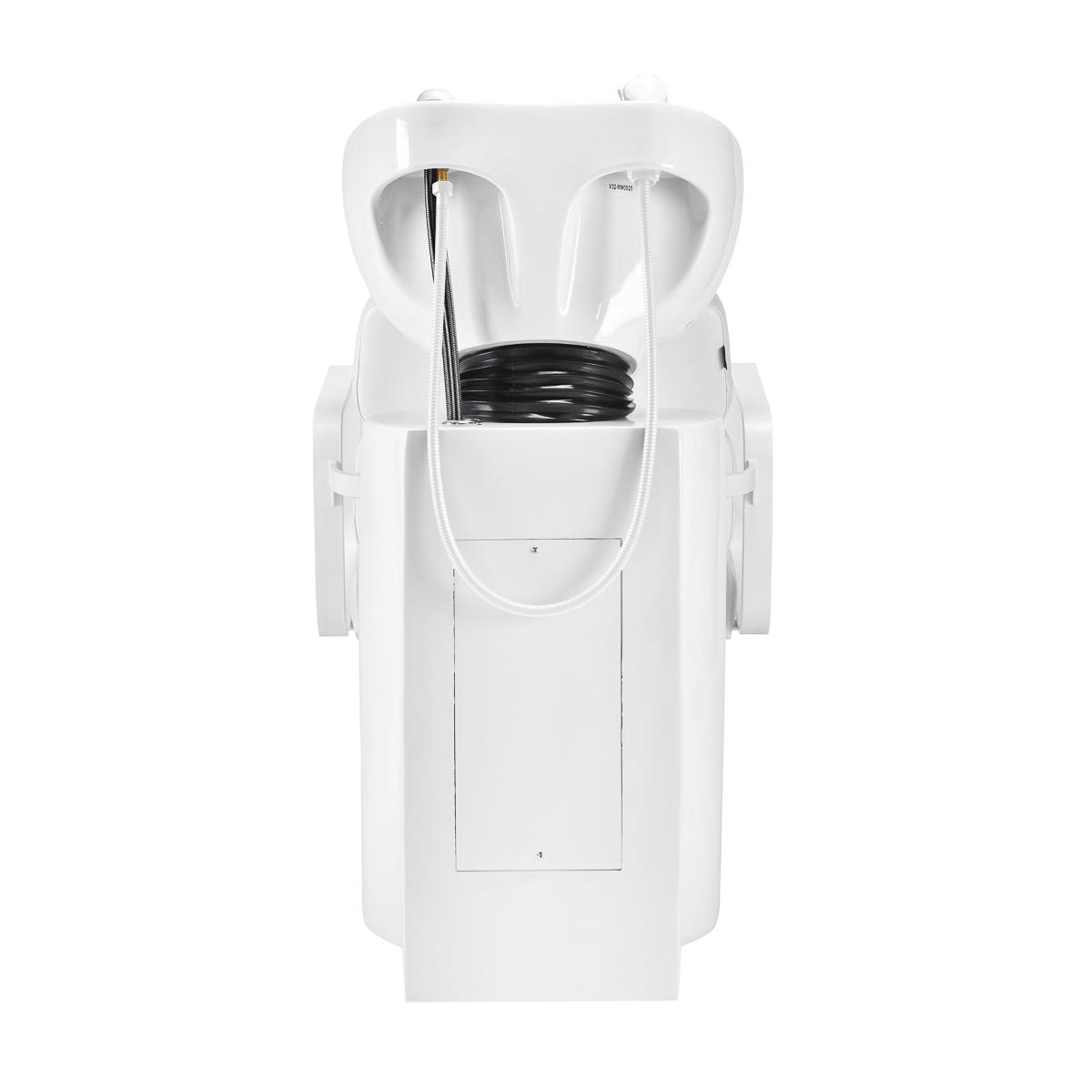 De juiste diepte van de witte keramische wastafelkom voorkomt overmatig spetteren van water of producten die tijdens de behandeling worden gebruikt. Dit zorgt voor comfortabele en effectieve uitvoering van een breed scala aan behandelingen. De hoek van de kom is verstelbaar, waardoor deze eenvoudig aan te passen is aan individuele behoeften. De hoge kwaliteit van de gebruikte materialen maakt de wastafel duurzaam, bestand tegen verkleuring en krassen, en zeer eenvoudig schoon te maken. Een goed gevormde kraag en schuine rugleuning bieden ondersteuning en comfort tijdens het wassen van het haar. Dankzij de comfortabele zwarte kunststof overlay voelt de klant geen enkele onaangename koude keramische oppervlakte.