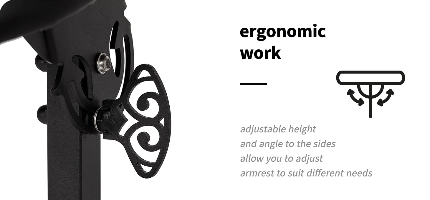 De hoogte van de armsteun kan worden aangepast binnen de limieten 72-110 cm, waardoor deze mogelijk is aan te passen aan verschillende klanten en garandeert optimale ondersteuning tijdens de tattoo-sessie. Dit model is uitgerust met een metalen voetsteun die de persoon die de tatoeage uitvoert, helpt een ergonomische houding aan te nemen. De functie van de hellingsverstelling van links naar rechts maakt het gemakkelijker om de positie van de armsteun aan te passen, wat voor nog meer comfort zorgt tijdens het tatoeëren. Een belangrijke functie van dit model is de mogelijkheid tot onafhankelijke hoogteverstelling aan beide zijden van de armsteunen, wat zorgt voor een speciaal roze schuifelement van onderaf. Een groot aantal aanpassingsmogelijkheden heeft een aanzienlijke invloed op de werkergonomie en het comfort van de klant.