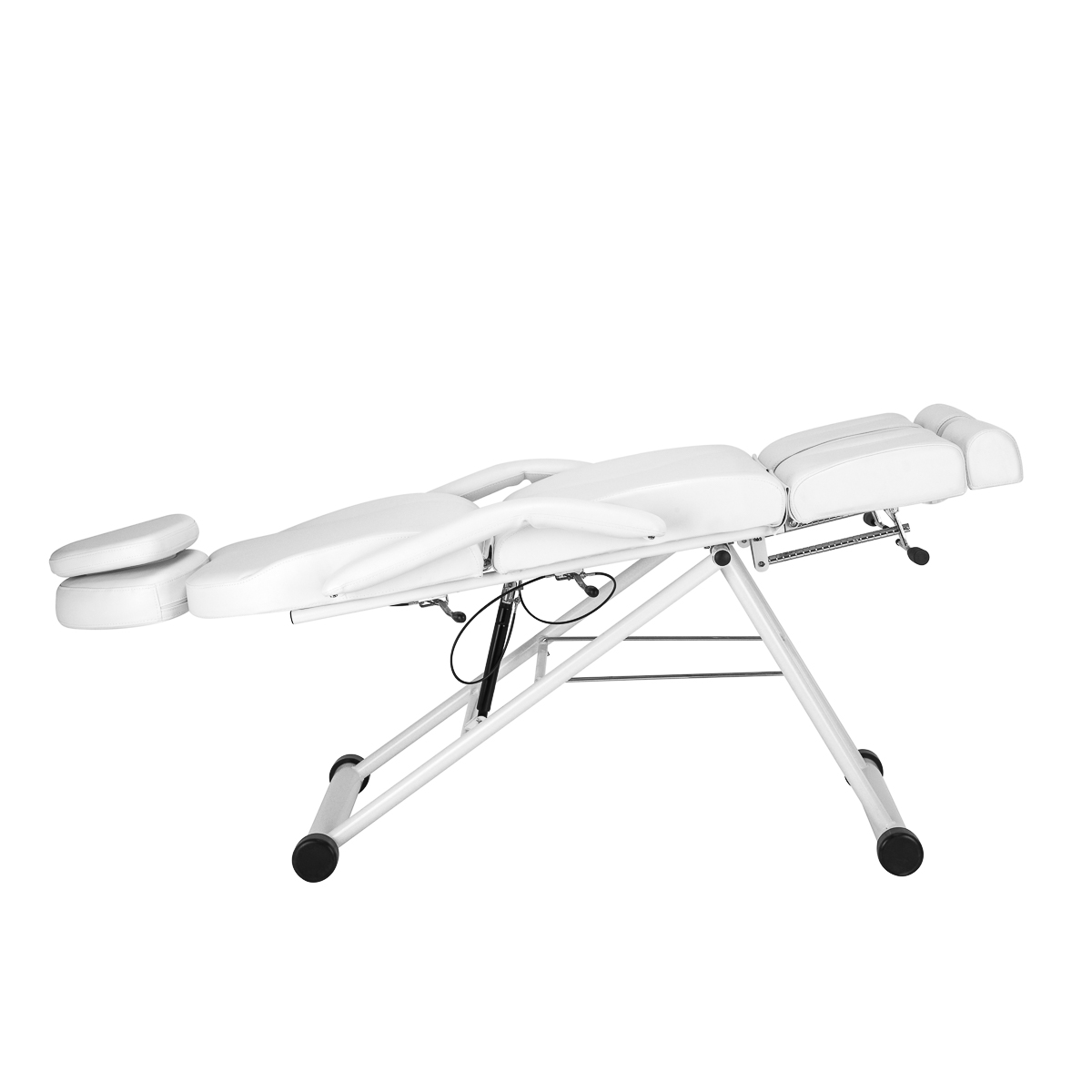 De aanpassing van de hoeken waaronder de voetsteun en rugleuning zich bevinden, wordt verzorgd door een speciaal mechanisme. Met behulp van handmatige hendels kunt u de positionering van de stoel vrij aanpassen. Dit maakt een optimale instelling mogelijk om aan de individuele behoeften te voldoen, voor een goede en gemakkelijke uitvoering van behandelingen en een hoog gebruikscomfort. De stoel kan worden uitgeklapt tot bankpositie en bereikt een maximale lengte van ruim 2 m, wat de functionaliteit aanzienlijk vergroot, en samen met de opening in de hoofdsteun zorgt dit voor de vrijheid om te presteren gezichts- en lichaamsbehandelingen.