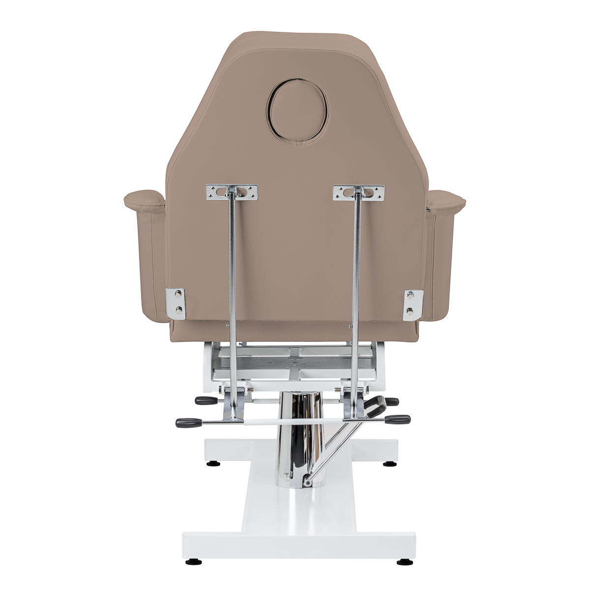 La hauteur du siège peut être réglée sans les mains de 62 à 75 cm à l'aide d'une pompe hydraulique. Cela permet une utilisation confortable de l'équipement pour des personnes de différentes tailles et permet de l'adapter aux besoins individuels du client et de la personne qui effectue le traitement. Le mécanisme utilisé est très durable et fiable. Grâce au trou dans l'appui-tête, caché sous un coussin bien ajusté, la chaise est également parfaite pour les traitements du dos, tels que les massages ou les tatouages.