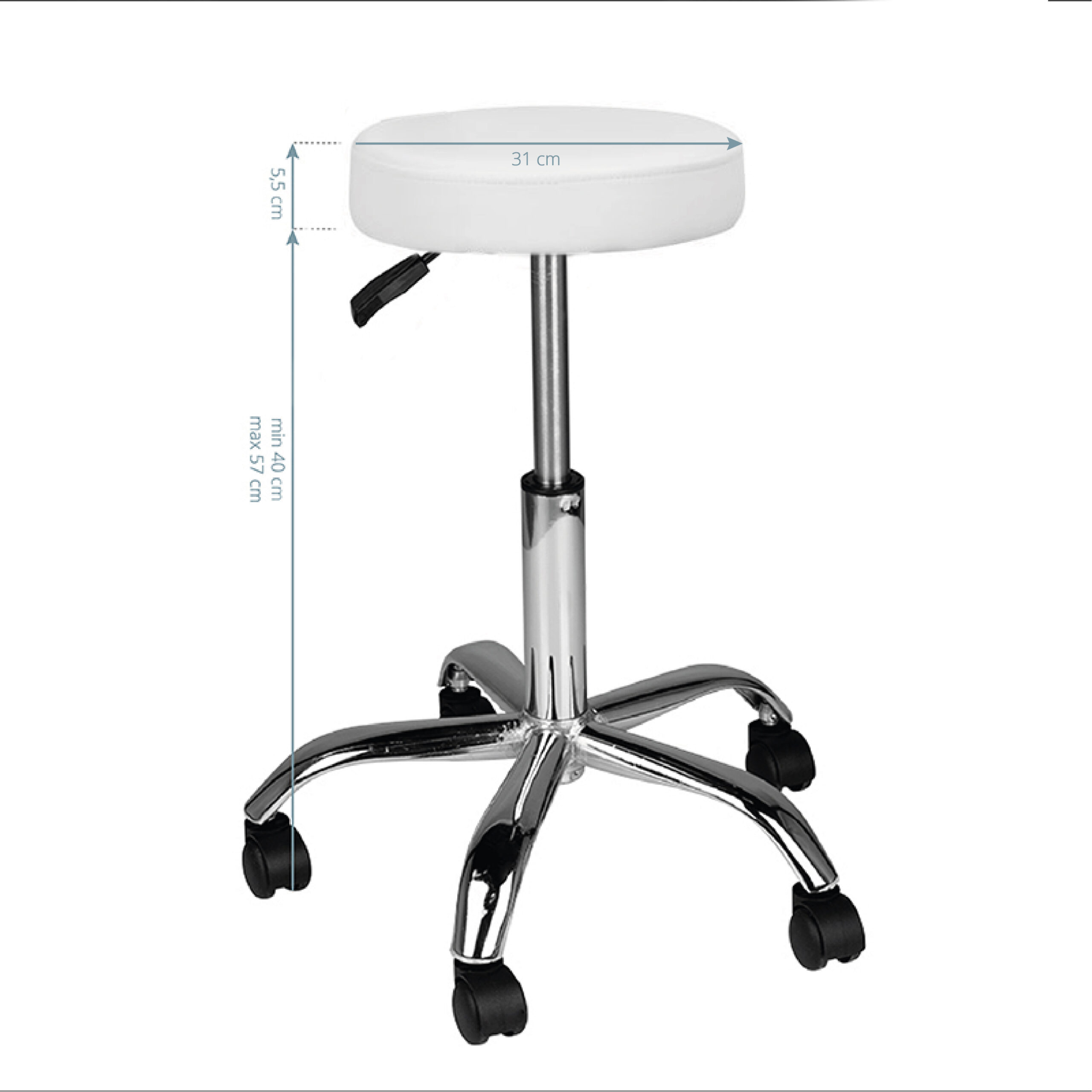 Tabouret cosmétique am-310 blanc confortable Tabouret cosmétique, stable sur une base à cinq branches, avec roulettes en caoutchouc, sans dossier, blanc, un meuble indispensable dans un salon de beauté.