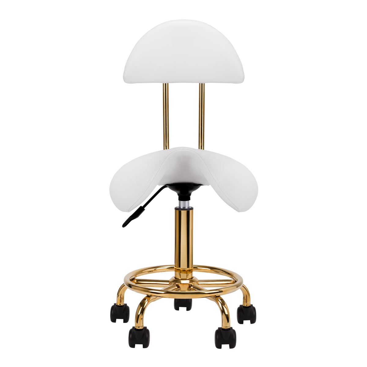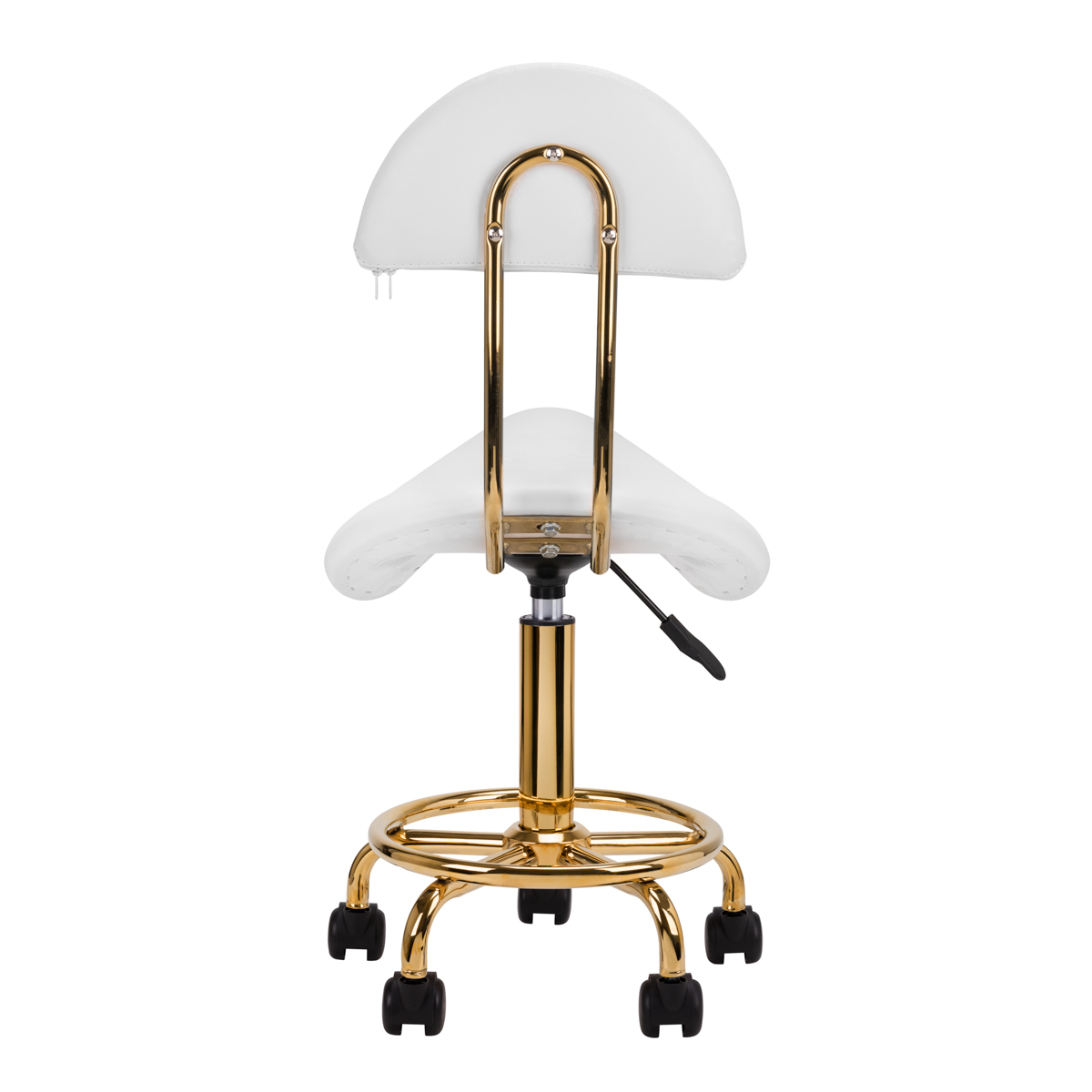 Tabouret cosmétique confortable et stable avec dossier, avec assise profilée, éléments métalliques dorés. Base à cinq branches avec roulettes en plastique. Disponible en blanc, un meuble indispensable dans un salon de beauté. Surfaces en métal laqué.