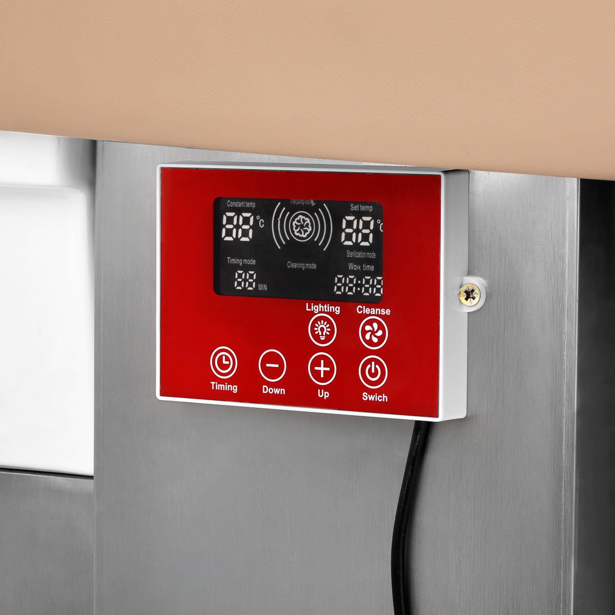 Het intuïtieve touchscreen biedt volledige controle over de functies van de wasunit. Hiermee kunt u de wastijd en de watertemperatuur aanpassen en de huidige waarden controleren. Dankzij het ingebouwde display kunt u op elk moment zien hoe lang het apparaat al in gebruik is. Via het paneel kunt u ook de lichttherapiefunctie activeren, oftewel de verlichting van de waskom, waardoor een ontspannen en luxe sfeer ontstaat. Bovendien is het stoomtherapieapparaat voorzien van een afstandsbediening, waardoor bediening op afstand gemakkelijk is.