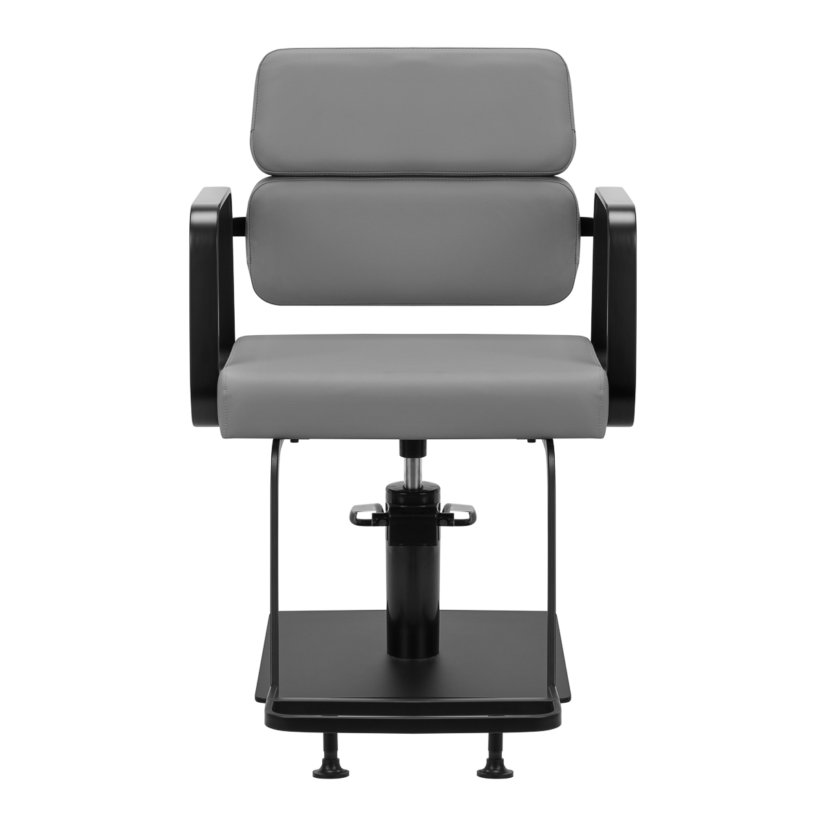Het volledige rotatiemechanisme van de stoel maakt het werk van de kapper effectiever en comfortabeler. Een solide, vlakke, vierkante basis garandeert stabiliteit tijdens gebruik. Het matte, gladde oppervlak geeft het element een elegante uitstraling en maakt het gemakkelijk schoon te houden. Een comfortabele zitting met schuimvulling zorgt voor een hoog gebruikscomfort, zelfs tijdens vele uren behandeling. Geometrische, metalen armleuningen zorgen voor de juiste positionering van de schouders van de klant – dit betekent dat hij zijn hoofd niet in zijn schouders steekt of onderuitgezakt zit – wat het veel gemakkelijker maakt om precieze behandelingen uit te voeren, inclusief knippen. Een stijlvolle voetensteun, speciaal voor dit model, biedt stabiele ondersteuning voor de voeten van de gebruiker.