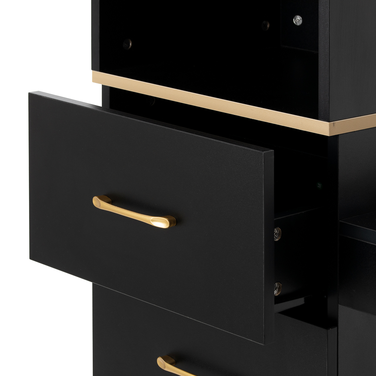 De stevige constructie garandeert stabiliteit, terwijl de gladde oppervlakken het gemakkelijk maken om de unit schoon te houden. De klassieke kleurstelling geeft de kast een tijdloos karakter dat perfect past in zowel minimalistische als meer uitgesproken interieurs. De gouden handgrepen benadrukken niet alleen het elegante design, maar zorgen er ook voor dat elke kast en lade soepel opent. De complete unit is een praktische oplossing voor een kapsalon, waar orde, ergonomische werkomstandigheden en een consistente esthetiek essentieel zijn.