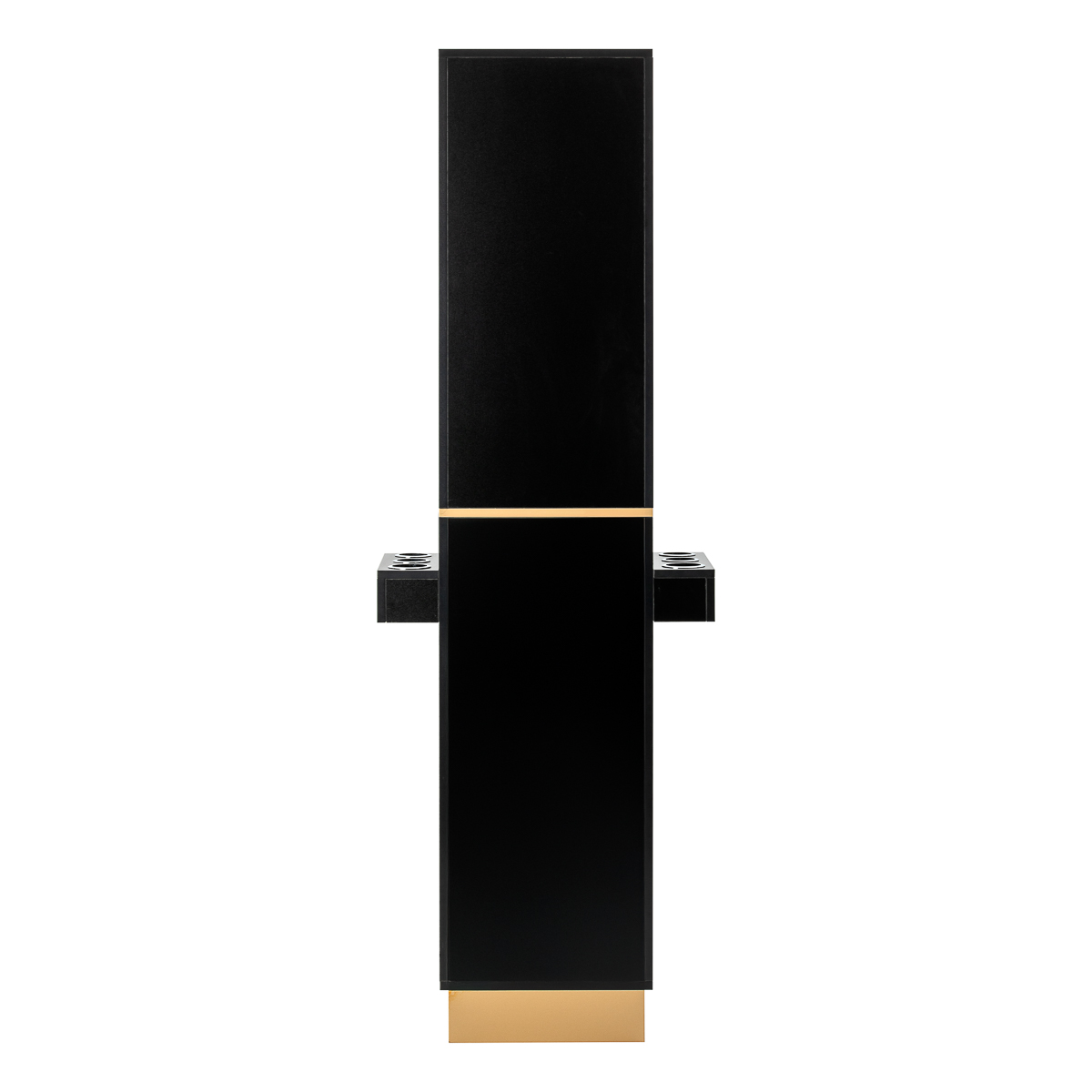Gabbiano Het model benadrukt het professionele karakter van het interieur en ondersteunt een efficiënte organisatie van de werkruimte. De minimalistische vorm, afgewerkt in zwarttinten en geaccentueerd met gouden details, geeft het meubelstuk een elegante en luxueuze uitstraling die perfect past in moderne kappers- en barbierinrichtingen.