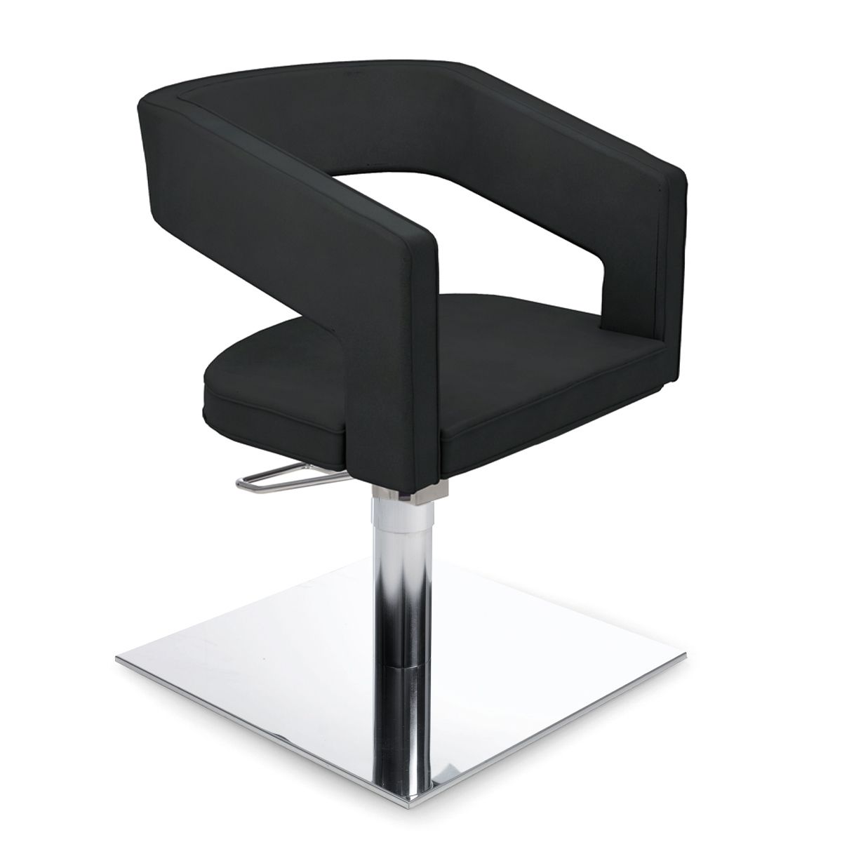 Nelson Gestoffeerde kappersstoel gemonteerd op een vierkant roestvrijstalen frame, uitvoering met een 360° draaibare en vergrendelbare hydraulische pomp.