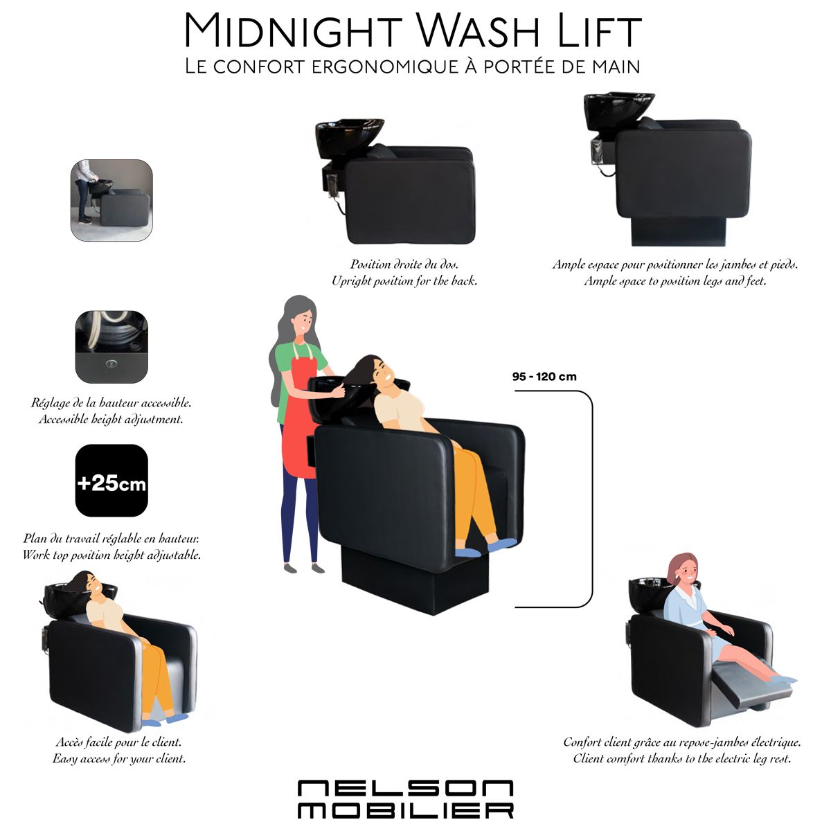 De Midnight Wash Lift verbetert zowel het comfort als de functionaliteit dankzij de elektrisch verstelbare hoogte van 25 cm, waardoor de hoogte tussen 95 cm en 120 cm kan worden ingesteld. Deze functie optimaliseert de ergonomie voor de kapper, vermindert vermoeidheid en zorgt voor optimale werkomstandigheden.